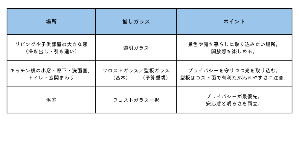 予算を優先する場合は型板ガラスという選択肢もありますが、ハレノイエでは「型板よりもフロスト」を基本におすすめ しています。